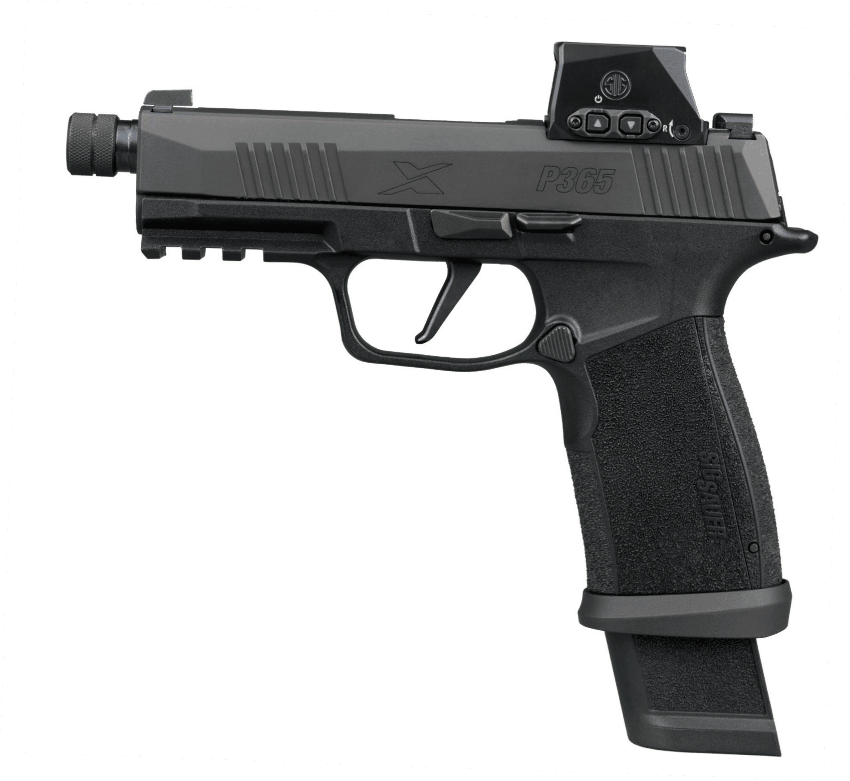 • Optics-Ready with Integrated Romeo-X Red Dot: The slide is precision-milled with Sig Sauer’s proprietary SIG-LOC direct-mount system, eliminating the need for adapter plates. It comes equipped with a rugged Romeo-X optic, offering a clear sight picture for faster target acquisition and improved accuracy.